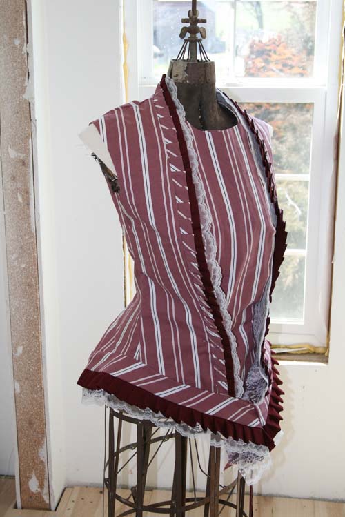 Wonderful mauve/burgundy stripe that I got at a fabulous price. Now what? Oh! I've found it -- 1876 it's got to be! This is making up beautifully and Shawn from La Victoria Rose Millinery made the perfect hat for me! Exciting!